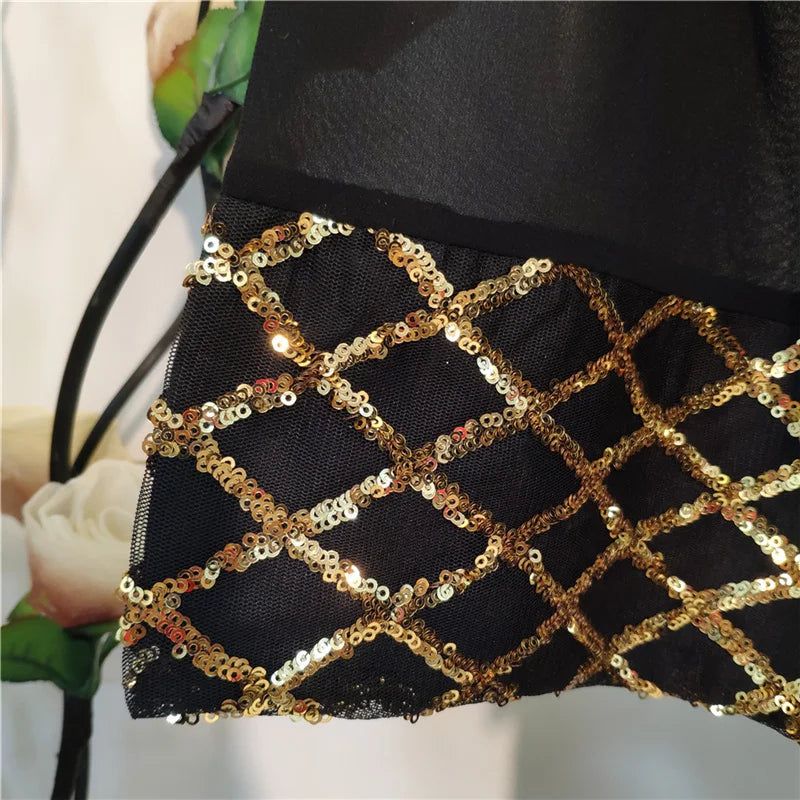 • Ornée par des strass dorés et noirs : Ajoute une touche de glamour et d’éclat à la tenue, mettant en valeur son design raffiné.