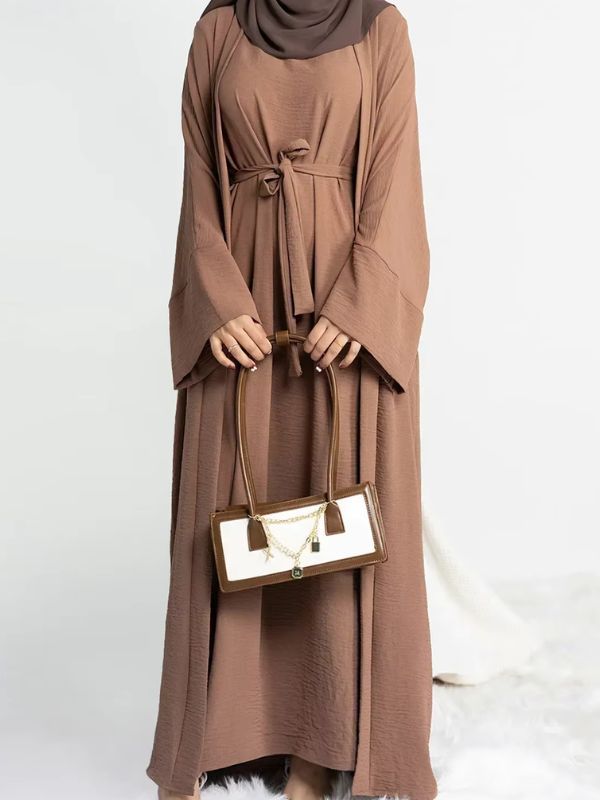 Découvrez l’Abaya Kimono 2 pièces « Café » sur vêtement oriental, une pièce élégante et polyvalente qui allie confort et sophistication pour sublimer votre style en toutes occasions.