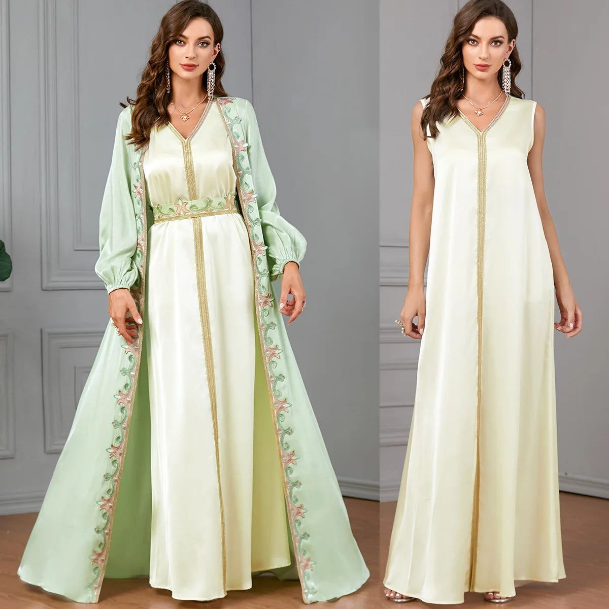 Apportez une touche d’élégance à votre garde-robe avec l’Abaya Kimono 2 Pièces de vêtement oriental, un ensemble chic et polyvalent qui vous permettra de briller en toute occasion.